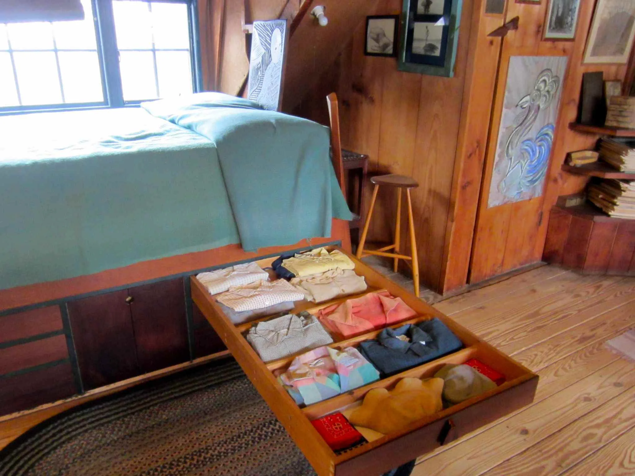 On the opposite end of the Escherick spectrum, at least in the furniture sense, is his bed and drawers pictured at right. His practicality led him to some ideas that seem shaker-esk as I said earlier, and yet when placed within his home amongst so many pieces of art and sculpture they seem all the more mad. The drawer in the picture is part of his dresser, which sits under his bed, both in order to raise his bed to the level of the southern facing window bay, and also to leave more room for his beloved books. He hated searching through drawers, however, for articles of clothing, so instead he made several shallow drawers which would be only a couple folded shirts deep.